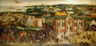 Charles V, the nephew of Henry's wife Catherine, inherited a large empire in Europe, becoming king of Spain in 1516 and Holy Roman Emperor in 1519. When Louis XII of France died in 1515, he was succeeded by his cousin Francis I.[49] These accessions left three relatively young rulers and an opportunity for a clean slate. The careful diplomacy of Cardinal Thomas Wolsey had resulted in the Treaty of London in 1518, aimed at uniting the kingdoms of western Europe in the wake of a new Ottoman threat, and it seemed that peace might be secured.[50] Henry met the new French King, Francis, on 7 June 1520 at the Field of the Cloth of Gold near Calais for a fortnight of lavish entertainment. Both hoped for friendly relations in place of the wars of the previous decade. The strong air of competition laid to rest any hopes of a renewal of the Treaty of London, however, and conflict was inevitable.[50] Henry had more in common with Charles, whom he met once before and once after Francis. Charles brought his realm into war with France in 1521; Henry offered to mediate, but little was achieved and by the end of the year Henry had aligned England with Charles. He still clung to his previous aim of restoring English lands in France but sought to secure an alliance with Burgundy, then a territorial possession of Charles, and the continued support of the Emperor.[51] A small English attack in the north of France made up little ground. Charles defeated and captured Francis at Pavia and could dictate peace, but he believed he owed Henry nothing. Sensing this, Henry decided to take England out of the war before his ally, signing the Treaty of the More on 30 August 1525.[52]