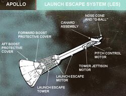 The LES included three wires that ran down the exterior of the launch vehicle. If the signals from any two of the wires were lost, the LES would activate automatically.[4] Alternatively, the Commander could activate the system manually using one of two translation controller handles, which were switched to a special abort mode for launch. When activated, the LES would fire a solid fuel escape rocket and open a canard system to direct the CM away from, and off the path of, a launch vehicle in trouble. The LES would then jettison and the CM would land with its parachute recovery system.