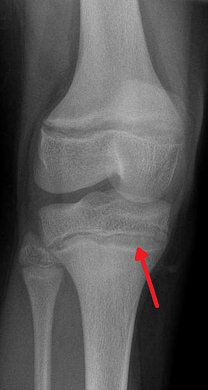 | An X ray demonstrating the characteristic finding of lead poisoning in humans—dense metaphyseal lines. | |