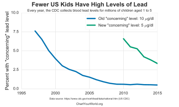 The levels found today in most people are orders of magnitude greater than those of pre-industrial society.[61] Due to reductions of lead in products and the workplace, acute lead poisoning is rare in most countries today, but low level lead exposure is still common.[239] It was not until the second half of the 20th century that subclinical lead exposure became understood to be a problem.[227] During the end of the 20th century, the blood lead levels deemed acceptable steadily declined.[240] Blood lead levels once considered safe are now considered hazardous, with no known safe threshold.[75][241]
