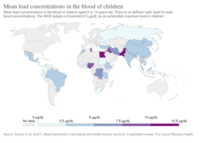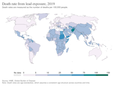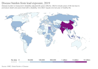 In 2016, lead is believed to have resulted in 540,000 deaths worldwide.[2] It occurs most commonly in the developing world.[2] Those who are poor are at greater risk.[2] Lead is believed to result in 0.6% of the world's disease burden.[5] People have been mining and using lead for thousands of years.[4] Descriptions of lead poisoning date to at least 2000 BC,[4] while efforts to limit lead's use date back to at least the 16th century.[5] Concerns for low levels of exposure begin in the 1970s with there being no safe threshold for lead exposure.[2][4]