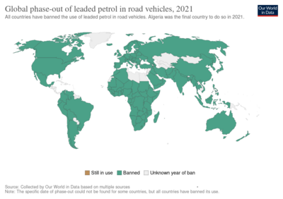 The 20th century saw an increase in worldwide lead exposure levels due to the increased widespread use of the metal.[237] Beginning in the 1920s, lead was added to gasoline to improve its combustion; lead from this exhaust persists today in soil and dust in buildings.[77] Blood lead levels worldwide have been declining sharply since the 1980s, when leaded gasoline began to be phased out.[77] In those countries that have banned lead in solder for food and drink cans and have banned leaded gasoline additives, blood lead levels have fallen sharply since the mid-1980s.[238]