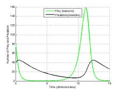 Predator–prey interactions exhibit natural oscillations in the populations of both predator and the prey.[21] In 1925, the American mathematician Alfred J. Lotka developed simple equations for predator–prey interactions in his book on biomathematics.[22] The following year, the Italian mathematician Vito Volterra, made a statistical analysis of fish catches in the Adriatic[23] and independently developed the same equations.[24] It is one of the earliest and most recognised ecological models, known as the Lotka-Volterra model:
