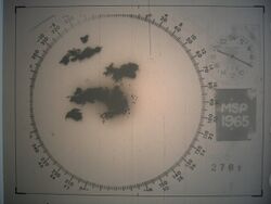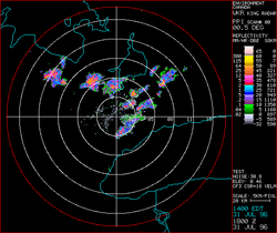 During World War II, military radar operators noticed noise in returned echoes due to rain, snow, and sleet. After the war, military scientists returned to civilian life or continued in the Armed Forces and pursued their work in developing a use for those echoes. In the United States, David Atlas[1] at first working for the United States Air Force and later for MIT, developed the first operational weather radars. In Canada, J.S. Marshall and R.H. Douglas formed the "Stormy Weather Group" in Montreal.[2][3] Marshall and his doctoral student Walter Palmer are well known for their work on the drop size distribution in mid-latitude rain that led to understanding of the Z-R relation, which correlates a given radar reflectivity with the rate at which rainwater is falling. In the United Kingdom, research continued to study the radar echo patterns and weather elements such as stratiform rain and convective clouds, and experiments were done to evaluate the potential of different wavelengths from 1 to 10 centimeters. By 1950 the UK company EKCO was demonstrating its airborne 'cloud and collision warning search radar equipment'.[4]