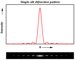 The radar beam has a distribution of energy similar to the diffraction pattern of a light passing through a slit.[15] This is because the wave is transmitted to the parabolic antenna through a slit in the wave-guide at the focal point. Most of the energy is at the center of the beam and decreases along a curve close to a Gaussian function on each side. However, there are secondary peaks of emission that will sample the targets at off-angles from the center. Designers attempt to minimize the power transmitted by such lobes, but they cannot be eliminated.
