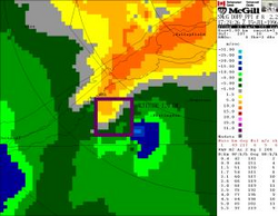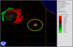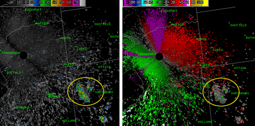 An image shows the Park Forest, Illinois, meteorite fall which occurred on 26 March 2003. The red-green feature at the upper left is the motion of clouds near the radar itself, and a signature of falling meteorites is inside the yellow ellipse at image center. The intermixed red and green pixels indicate turbulence, in this case arising from the wakes of falling, high-velocity meteorites.