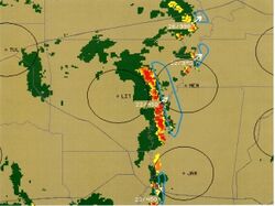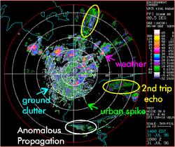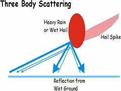It is assumed that the beam hits the weather targets and returns directly to the radar. In fact, there is energy reflected in all directions. Most of it is weak, and multiple reflections diminish it even further so what can eventually return to the radar from such an event is negligible. However, some situations allow a multiple-reflected radar beam to be received by the radar antenna.[15] For instance, when the beam hits hail, the energy spread toward the wet ground will be reflected back to the hail and then to the radar. The resulting echo is weak but noticeable. Due to the extra path length it has to go through, it arrives later at the antenna and is placed further than its source.[56] This gives a kind of triangle of false weaker reflections placed radially behind the hail.[44]