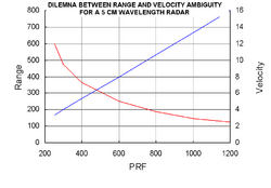 Some techniques using two alternating pulse repetition frequencies (PRF) allow a greater Doppler range. The velocities noted with the first pulse rate could be equal or different with the second. For instance, if the maximum velocity with a certain rate is 10 metre/second and the one with the other rate is 15 m/s. The data coming from both will be the same up to 10 m/s, and will differ thereafter. It is then possible to find a mathematical relation between the two returns and calculate the real velocity beyond the limitation of the two PRFs.