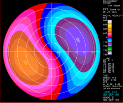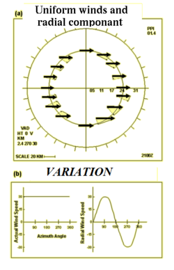 In the synoptic scale interpretation, the user can extract the wind at different levels over the radar coverage region. As the beam is scanning 360 degrees around the radar, data will come from all those angles and be the radial projection of the actual wind on the individual angle. The intensity pattern formed by this scan can be represented by a cosine curve (maximum in the precipitation motion and zero in the perpendicular direction). One can then calculate the direction and the strength of the motion of particles as long as there is enough coverage on the radar screen.