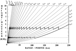 CAPPIs call for a large number of angles from near the horizontal to near the vertical of the radar to have a cut that is as close as possible at all distance to the height needed. Even then, after a certain distance, there isn't any angle available and the CAPPI becomes the PPI of the lowest angle. The zigzag line on the angles diagram above shows the data used to produce 1.5 km and 4 km height CAPPIs. Notice that the section after 120 km is using the same data.