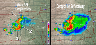 Another solution to the PPI problems is to produce images of the maximum reflectivity in a layer above ground. This solution is usually taken when the number of angles available is small or variable. The American National Weather Service is using such Composite as their scanning scheme can vary from 4 to 14 angles, according to their need, which would make very coarse CAPPIs. The Composite assures that no strong echo is missed in the layer and a treatment using Doppler velocities eliminates the ground echoes. Comparing base and composite products, one can locate virga and updrafts zones.