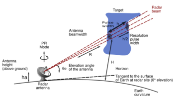 As demonstrated at the start of the article, radar beams have a physical dimension and data are sampled at discrete angles, not continuously, along each angle of elevation.[44] This results in an averaging of the values of the returns for reflectivity, velocities and polarization data on the resolution volume scanned.