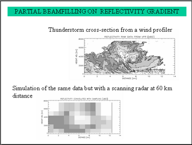 In the figure to the left, at the top is a view of a thunderstorm taken by a wind profiler as it was passing overhead. This is like a vertical cross section through the cloud with 150-metre vertical and 30-metre horizontal resolution. The reflectivity has large variations in a short distance. Compare this with a simulated view of what a regular weather radar would see at 60 km, in the bottom of the figure. Everything has been smoothed out. Not only the coarser resolution of the radar blur the image but the sounding incorporates area that are echo free, thus extending the thunderstorm beyond its real boundaries.