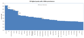 The 30–highest peaks in the world with over 500 m (1,640 ft) in prominence[10]