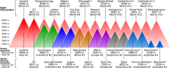 Comparison of the heights of the Eight-thousanders (red triangles) with the Seven Summits and Seven Second Summits