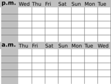 A sleep diary, also called sleep log or sleep journal, kept by a patient at home for at least two weeks, while subjective, may help determine the extent and nature of sleep disturbance and the level of alertness in the normal environment. A parallel journal kept by a parent or bed partner, if any, can also be helpful. Sleep logs can also be used for self-monitoring and in connection with behavioral and other treatment. The image at the top of this page, with nighttime in the middle and the weekend in the middle, shows a layout that can aid in noticing trends