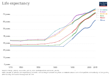 This is a list of countries showing past life expectancy, ranging from 1950 to 2015 in five-year periods, as estimated by the 2017 revision of the World Population Prospects database by the United Nations Population Division. Life expectancy equals the average number of years a person born in a given country is expected to live if mortality rates at each age were to remain steady in the future. The life expectancy is shown as the average of males and females.