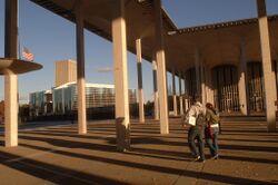 At the hub of the Uptown Campus is the rectangular "Academic Podium", featuring 13 three-story buildings under a single overhanging canopy roof. The Podium's showpiece is a central pool with fountains and an off-center circular bell tower, or "Carillon", which also serves as a water storage reservoir.[28] In April 2012, the university undertook a complete renovation of the main fountain and water tower area, as well as of the Campus Center fountain. There is LED lighting in the base of the fountain, and a new, more interactive center element with seating areas. Completion of the project is scheduled for fall 2013.[29]