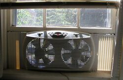 Window fans are designed to fit into open windows, and often have expandable side panels to cover the entire window opening. Most units have either one large fan, or two small fans mounted side by side.[1]