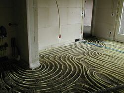 Also known as "radiant heat", underfloor heating uses a network of pipes, tubing or heating cables, buried in or attached beneath a floor to allow heat to rise into the room. Best results are achieved with conductive flooring materials such as tile. The large surface area of such room-sized radiators allows them to be kept just a few degrees above desired room temperature, minimizing convection. Underfloor heating is more expensive in new construction than less efficient systems. It also is generally difficult to retrofit into existing buildings.