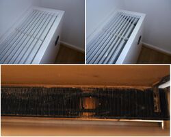 Baseboard convectors are designed to heat the air in the room using convection to transfer heat from the radiators to the surrounding air.[4] They do this by drawing cool air in at the bottom, warming the air as it passes over the radiator fins, and discharging the heated air at the top. This sets up convective loops of air movement within a room. If the radiator is blocked either from above or below, this air movement is prevented, and the heater will not work. Baseboard heating systems are sometimes fitted with moveable covers to allow the resident to fine-tune heating by room, much like air registers in a central air system.