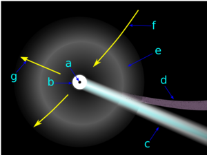 Diagram showing the physical characteristics of a comet: a) Nucleus, b) Coma, c) Gas/ion tail d) Dust tail, e) Hydrogen envelope, f) Orbital velocity direction, g) Direction to the Sun.