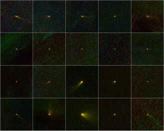 (As of November 2021), there are 4,584 known comets.[7] However, this represents a very small fraction of the total potential comet population, as the reservoir of comet-like bodies in the outer Solar System (in the Oort cloud) is about one trillion.[8][9] Roughly one comet per year is visible to the naked eye, though many of those are faint and unspectacular.[10] Particularly bright examples are called "great comets". Comets have been visited by uncrewed probes such as NASA's Deep Impact, which blasted a crater on Comet Tempel 1 to study its interior, and the European Space Agency's Rosetta, which became the first to land a robotic spacecraft on a comet.[11]