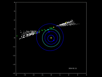 Comets usually have highly eccentric elliptical orbits, and they have a wide range of orbital periods, ranging from several years to potentially several millions of years. Short-period comets originate in the Kuiper belt or its associated scattered disc, which lie beyond the orbit of Neptune. Long-period comets are thought to originate in the Oort cloud, a spherical cloud of icy bodies extending from outside the Kuiper belt to halfway to the nearest star.[1] Long-period comets are set in motion towards the Sun by gravitational perturbations from passing stars and the galactic tide. Hyperbolic comets may pass once through the inner Solar System before being flung to interstellar space. The appearance of a comet is called an apparition.