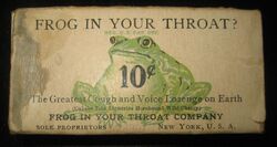 Early 20th century "Frog In Your Throat" box, containing lozenges made of cubeb, tolu balsam, liquorice, white horehound and wild cherry extracts.