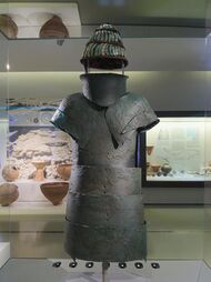 There are four types of graves that are found at sites from the Middle Helladic period; pit graves, tholos graves, cist graves, and shaft graves. A pit grave is self explanatory, as it is simply a pit in the ground, while tholos styled graves are characterized as being more of a chamber like tomb.[21] Cist graves and shaft graves are interesting because they are two styles of burial that originate from the Middle Helladic period itself,[21] and it is believed that migrants who moved to Greece during this period influenced the creation of these new burial styles. Cist graves are deep and rectangular with a tumulus, or mound of earth, placed over top and came about during the beginning of the Middle Helladic period. Shaft graves are larger and deeper than cist graves (measuring on average 6 meters long, 4 meters wide, and 4 meters deep) and came about during the end of the Middle Helladic period.[21] Additionally, infants are buried in special jars, pithoi, that generally measure around 30 inches (76 cm) tall. Based on the archaeological evidence, at Middle Helladic burial ceremonies bodies are placed in graves on their sides with their knees bent (women are placed on their left sides, and men on their right[23]), then those present at the ceremony drink from cups that they then leave at the tomb.[21] Burial customs also included leaving valued items with the bodies like pottery, silver, or bronze.[23]