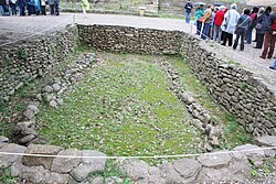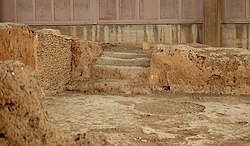 Another settlement was Lerna in the Argolid region, which was perhaps the most important and wealthiest of Early Helladic sites.[30] The settlement has a monumental building known as the House of the Tiles, a "corridor house",[31] notable for several architectural features that were advanced for its time, such as its roof being covered by baked tiles, which gave the building its name.[32] The structure dates to the Early Helladic II period (2500–2300 BC) and is sometimes interpreted as the dwelling of an elite member of the community, a proto-palace, or an administrative center. Alternatively, it has also been considered to be a communal structure or the common property of the townspeople.[33] The exact functions of the building remain unknown due to a lack of small finds indicating the specific uses of the building.[33] The house had a stairway leading to a second story, and was protected by a tiled roof.[34] Debris found at the site contained thousands of terracotta tiles having fallen from the roof.[35] Although such roofs were also found in the Early Helladic site of Akovitika,[36] and later in the Mycenaean towns of Gla and Midea,[37] they only became common in Greek architecture in the 7th century BC.[38] The walls of the House of the Tiles were constructed with sun-dried bricks on stone socles.[32]