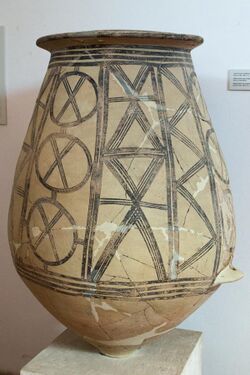 Matt-painted pottery, from the Middle Helladic period demonstrates many stylistic motifs that can be traced back to the Early Helladic Period and even other Aegean cultures. Patterns like oblique lines, zigzags, lozenges, running dogs, spiraliforme, and circles and triangles alternating one another beneath the rim on Middle Helladic pottery have been found to be inspired by Cycladic pottery motifs. Spiraliforme can also be traced back to Crete, as well as Griffon motifs. However, patterns like lozenges and pendent-style triangles on matt-painted pottery is a continuation of stylistic motifs from the Early Helladic period, and the addition of vertical fringed lines on pottery is an advancement that took place during the Middle Helladic period itself.[22] With the majority of designs and motifs on Middle Helladic pottery being Cycladic in influence it can be assumed that the Middle Helladic culture and the Cycladic culture interacted with one another heavily.