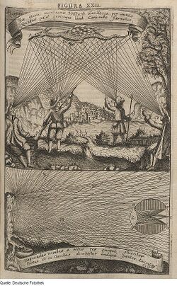 In the fifth century BC, Empedocles postulated that everything was composed of four elements; fire, air, earth, and water.[1] He believed that Aphrodite made the human eye out of the four elements and that she lit the fire in the eye which shone out from the eye, making sight possible.[2] If this were true, then one could see during the night just as well as during the day, so Empedocles postulated that there were two different types of emanations that interacted in some way: one that emanated from an object to the eye, and another that emanated from the eye to an object. He compared these outward-flowing emanations to the emission of light from a lantern.[2]