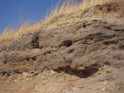 At Kern River Oil Field, there are no currently active seeps. However, oil-stained formations in the outcrops remain from previously active seeps.[30]