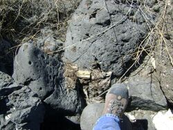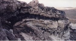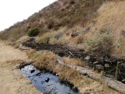 Seeps known as the McKittrick Tar Pits occur in the McKittrick Oil Field in western Kern County. Some of the seeps occur in watersheds that drain toward the San Joaquin Valley floor. These seeps were originally mined for asphalt by Native Americans, and in the 1870s larger scale mining was undertaken by means of both open pits and shafts. In 1893, Southern Pacific Railroad constructed a line to Asphalto, two miles from present day McKittrick. Fuel oil for the railroad was highly desired, especially since there are very few coal-bearing formations in California.[33] The field is produced now by conventional oil wells, as well as by steam fracturing.