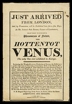 Sarah Baartman was a Khoikhoi woman from Cape Town, South Africa, in the early 1800s. She was taken to Europe and advertised as a sexual "freak" for entertainment. She was known as the "Hottentot Venus." She died in 1815 and was dissected. Baartman's genitalia, brain, and skeleton were displayed in the Musee de l'Homme in Paris until repatriation to South Africa in 2002.[4]