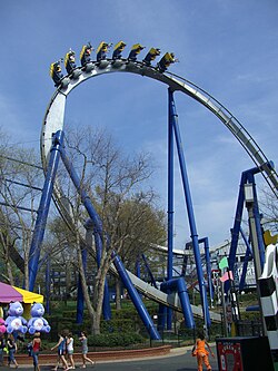 A vertical loop is one of the most common roller coaster inversions in existence. It is a continuous, upward-sloping section of track that eventually completes a 360-degree turn, inverting riders halfway into the element. They are ellipses in the shape of an oval or teardrop. Early roller coaster designs attempted vertical loops that were more circular, resulting in massive g-force that were dangerous to riders. The first successful implementation in the modern era of roller coasters was on Great American Revolution which opened at Six Flags Magic Mountain in 1976.