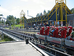 A drive tire, or squeeze tire depending on its usage, is essentially a motorized tire used to propel a roller coaster train along a piece of track. Although they are most often used in station areas and brake runs, they can also be used to launch trains at greater speeds. However, they are generally used to propel the train at speeds between 5-8 mph. The Incredible Hulk Coaster at Universal's Islands of Adventure is notable for using drive tires to launch the train up an incline. Some roller coasters, most noticeably Vekoma Roller Skaters (Vekoma's version of a junior coaster) and Zierer Tivoli/Force (also junior coasters) also use drive tires instead of a chain on lift hills. Drive tires are also used to power other types of amusement rides, such as ferris wheels, Pirate Ships, and other spinning rides. The Olympia Looping traveling roller coaster at Barth, Alpina Bahn and Mindbender at Galaxyland at the West Edmonton Mall also feature a drive tire instead of a chain on their lift hill.