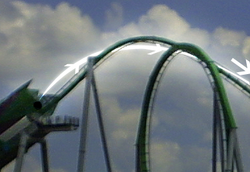 An inclined loop, also known as an oblique loop, is a 360° loop that has been tilted at an angle. It is not entered vertically, like a vertical loop, or horizontally like a helix. Instead, it is usually entered at an angle between 45° and 80°. Inclined loops can be found on B&M stand-up roller coasters, B&M Wing Coasters, and B&M Floorless Coasters. Examples include: Rougarou at Cedar Point; Green Lantern at Six Flags Great Adventure; Riddler's Revenge at Six Flags Magic Mountain; and The Swarm at Thorpe Park.
