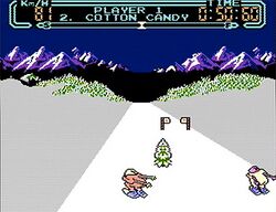 Slalom is a single-player game in which players race downhill in a series of slalom skiing races. There are 24 downhill runs total that are evenly spread across three mountains.[2] Before the game starts, players choose their mountain based on difficulty: Snowy Hill for beginners, Steep Peak for intermediate players, and Mount Nasty for experts.[3]:4 The goal for each run is to reach the finish line within the allotted time. Players must dodge obstacles including trees, flags, snowmen, sledders, and other skiers on their way downhill, or else they will tumble and lose time.[3]:5 With enough momentum, players can jump over these obstacles.[4] Players must ski around flags to maintain their speed. If they ski on the wrong side of the flag, the racer will snowplow and slow down.[3]:6
