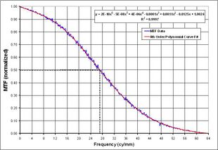 The one-dimensional optical transfer function can be calculated as the discrete Fourier transform of the line spread function. This data is graphed against the spatial frequency data. In this case, a sixth order polynomial is fitted to the MTF vs. spatial frequency curve to show the trend. The 50% cutoff frequency is determined to yield the corresponding spatial frequency. Thus, the approximate position of best focus of the unit under test is determined from this data.