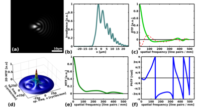 The image on the right shows the optical transfer functions for two different optical systems in panels (a) and (d). The former corresponds to the ideal, diffraction-limited, imaging system with a circular pupil. Its transfer function decreases approximately gradually with spatial frequency until it reaches the diffraction-limit, in this case at 500 cycles per millimeter or a period of 2 μm. Since periodic features as small as this period are captured by this imaging system, it could be said that its resolution is 2 μm.[1] Panel (d) shows an optical system that is out of focus. This leads to a sharp reduction in contrast compared to the diffraction-limited imaging system. It can be seen that the contrast is zero around 250 cycles/mm, or periods of 4 μm. This explains why the images for the out-of-focus system (e,f) are more blurry than those of the diffraction-limited system (b,c). Note that although the out-of-focus system has very low contrast at spatial frequencies around 250 cycles/mm, the contrast at spatial frequencies near the diffraction limit of 500 cycles/mm is diffraction-limited. Close observation of the image in panel (f) shows that the image of the large spoke densities near the center of the spoke target is relatively sharp.