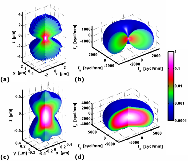 A three-dimensional optical transfer function can be calculated as the three-dimensional Fourier transform of the 3D point-spread function. Its color-coded magnitude is plotted in panels (b) and (d), corresponding to the point-spread functions shown in panels (a) and (c), respectively. The transfer function of the wide-field microscope has a support that is half of that of the confocal microscope in all three-dimensions, confirming the previously noted lower resolution of the wide-field microscope. Note that along the z-axis, for x = y = 0, the transfer function is zero everywhere except at the origin. This missing cone is a well-known problem that prevents optical sectioning using a wide-field microscope.[4]