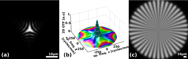 Optical systems, and in particular optical aberrations are not always rotationally symmetric. Periodic patterns that have a different orientation can thus be imaged with different contrast even if their periodicity is the same. Optical transfer function or modulation transfer functions are thus generally two-dimensional functions. The following figures shows the two-dimensional equivalent of the ideal and the imperfect system discussed earlier, for an optical system with trefoil, a non-rotational-symmetric aberration.