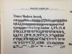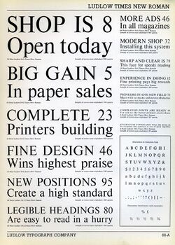 A Ludlow Typograph specimen of Times New Roman Type Specimen from the metal type period. The design was altered in smaller sizes to increase readability, particularly obvious in the widened spacing of the six and eight-point samples at centre right of the diagram.[38] The hollows at the top of upstrokes are also not seen in the standard digitisations.