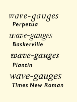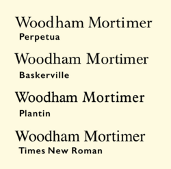 A digitisation of Times New Roman below the three typefaces originally considered as a basis for the Times project: Perpetua, Baskerville and Plantin. Times is most based on Plantin, but with the letters made taller and its appearance "modernised" by adding eighteenth- and nineteenth-century influences, in particular enhancing the stroke contrast. Compared to Baskerville and Perpetua, the x-height is a larger proportion of the type height.