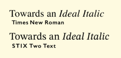 Morison described the companion italic as also being influenced by the typefaces created by the Didot family in the late 18th and early 19th centuries: a "rationalistic italic that owed nothing to the tradition of the sixteenth or seventeenth centuries. It has, indeed, more in common with the eighteenth century."[21][22][23] Morison had several years earlier attracted attention for promoting the radical idea that italics in book printing were too disruptive to the flow of text, and should be phased out.Cite error: Closing </ref> missing for <ref> tag This effect is not found in sixteenth-century typefaces (which, in any case, did not have bold versions); it is most associated with the Didone, or "modern" type of the early nineteenth century (and with the more recent 'Ionic' styles of type influenced by it that were offered by Linotype, discussed below).[20][24][25][26][27] Some commentators have found Times' bold unsatisfactory and too condensed, such as Walter Tracy.[28]