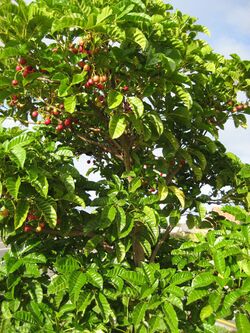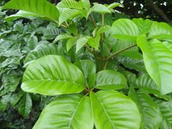 The dark green glossy leaves of pūriri are palmate with usually 5 leaflets, or sometimes three. The lowest two leaflets are smaller than the other three. The leaflets have domatia, little pockets where the mid vein and branching veins meet, which can house arthropods. The underside and veins are a lighter green.[7] Seedling leaves are much more delicate and a lighter green with serrations along the edge.[2] Seedling pūriri can be confused with seedlings of the kohekohe, or Dysoxylum spectabile; the most obvious difference is that pūriri leaflets originate from one point, whereas kohekohe leaflets are spread along the stalk. The branches of pūriri, especially the young ones, are square in cross-section.