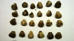 The fruit or drupe is a bright red (usually) to a pale yellow (rarely, and only on white flowered trees) "cherry". It can grow as big as a cherry, but it is unpleasantly astringent. When broken, the fruit has a bright thin juice, and a faint grape smell. Pūriri fruit is not the most nutritious sort in the New Zealand bush (high in carbohydrates, not lipids, sugars or calcium), but it is always there. The nut (endocarp) inside the drupe is a very hard pear-shaped kernel[3] that can contain up to 4 seeds. The seedlings from one kernel can germinate at the same time or be spread over a year.[2] The nut has four apertures in the endocarp each guarded by an oval door and each leading to a seed chamber. The Pūriri is self-fertile with self-fertilization (autogamy) possible. Seed production in 12 samples ranged from 8% to 45% with usually only 1 or 2 live seeds in a fruit. Low seed production is due to inefficiencies in pollination, as well as breakdown of apparently fully developed seeds. The factors controlling germination and opening of the doors are unknown, and most seed would appear to perish within the Imprisoning nut.[9]