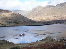 may mean one of several species of Salmonidae, which are found in both the Atlantic and Pacific, though Atlantic salmon numbers are severely depleted.[2] In the wild, salmon are born in rivers but spend most of their lives in the sea before swimming back up-river to spawn (normally returning to the same river).[3] Salmon farming typically takes place in large cages or nets open to the sea.[4] Normally, farmed fish will spend their whole lives in the cages, though there have been non-commercial schemes to breed salmon and release them into the wild, known as "ranching".[5] Salmon are carnivorous and eat other fish.[6]